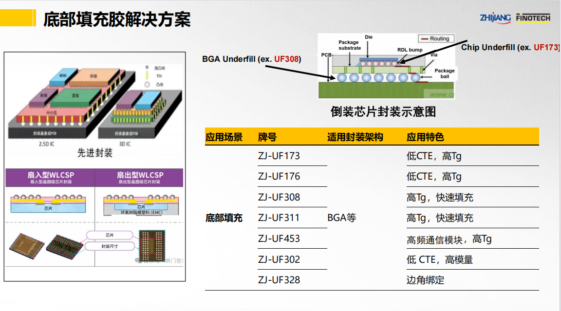 之江公司立足于中國膠粘劑行業領軍企業和有機硅、聚氨酯、環氧等專業膠粘劑的產業化優勢,具有國家級高新技術企業和國家級企業技術中心資質,依靠國家級CNAS實驗室以及國家級博士后科研工作站,并有國際專家助力,為半導體封裝行業提供高性能的芯片粘接和封裝解決方案。其中,關鍵產品如下: